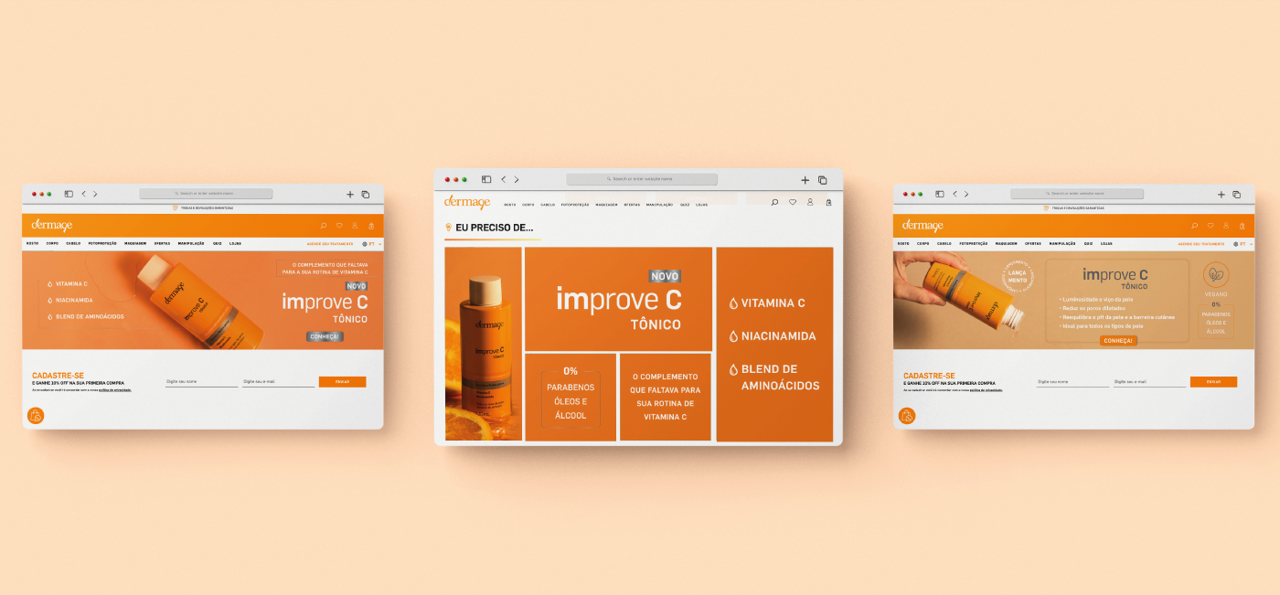 Banners e vitrine do site, posts para Instagram e Presskit para influenciadoras, desenvolvidos para campanha de lançamento do produto Improve C Tônico.