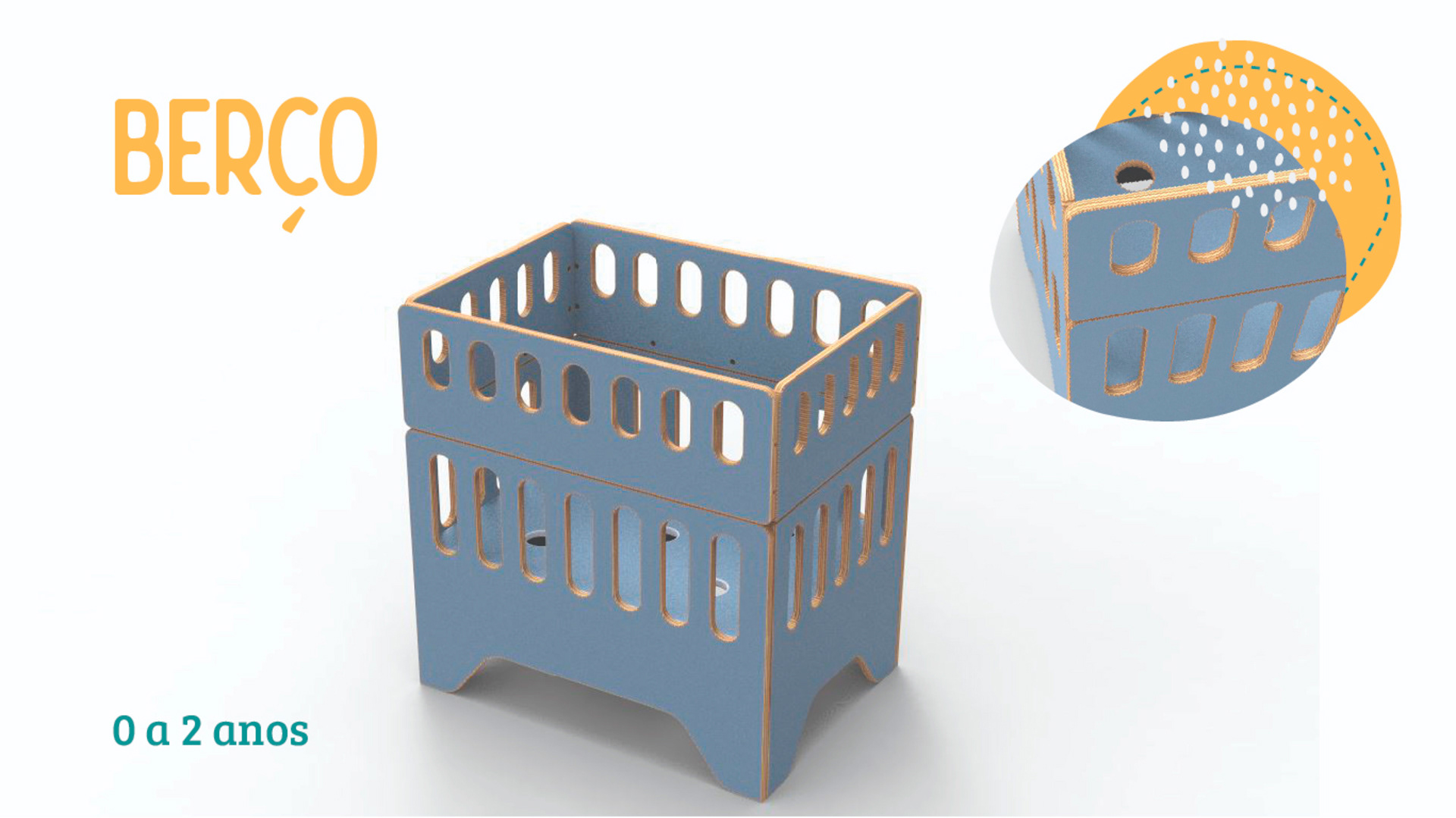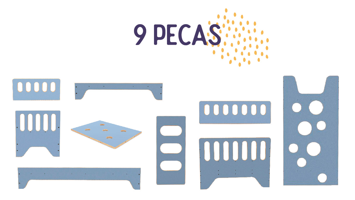Composto por 9 módulos diferentes, são necessárias 23 peças para montar as 4 opções que compõem a linha de móveis, que vai do berço a beliche, se adaptando as diferentes fases da infância e acompanhando o crescimento da criança.